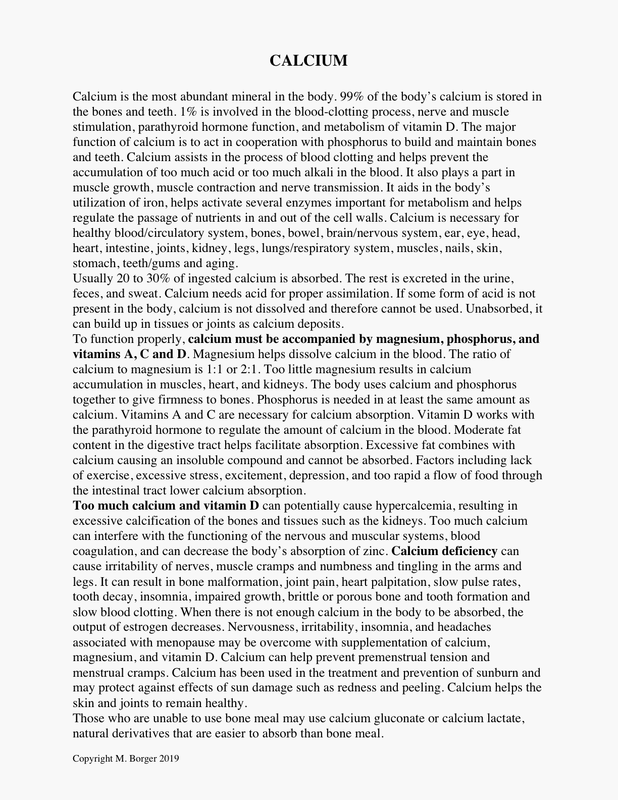 Calcium Calcium is the most abundant mineral in the body. 99% of the body's calcium is stored in the bones and teeth. 1% is involved in the blood-clotting clotting process, nerve and muscle stimulation, parathyroid hormone function, and metabolism of vitamin D. The major function of calcium is to act... read more |
