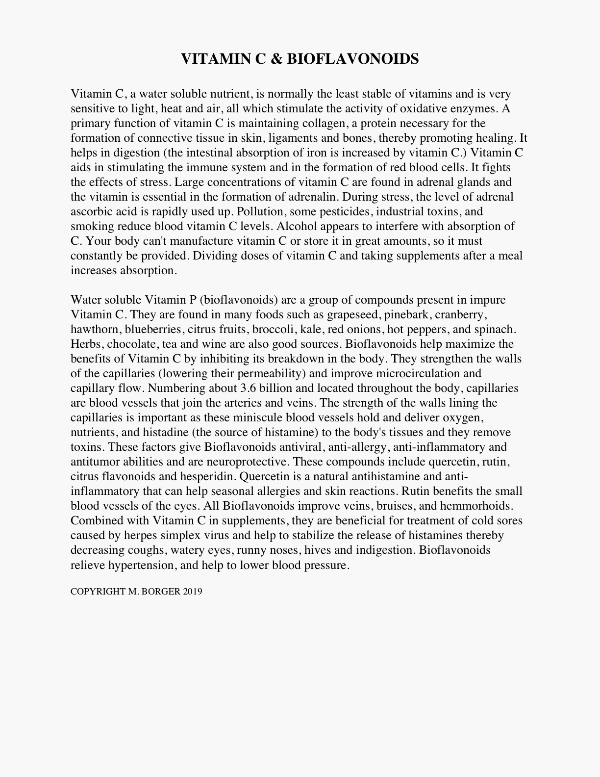 Vitamin C & Bioflavonoids Vitamin C, a water soluble nutrient, is normally the least stable of vitamins and is very sensitive to light, heat and air, all which stimulate the activity of oxidative enzymes. A primary function of vitamin C is maintaining collagen , a protein necessary for the formation... read more |